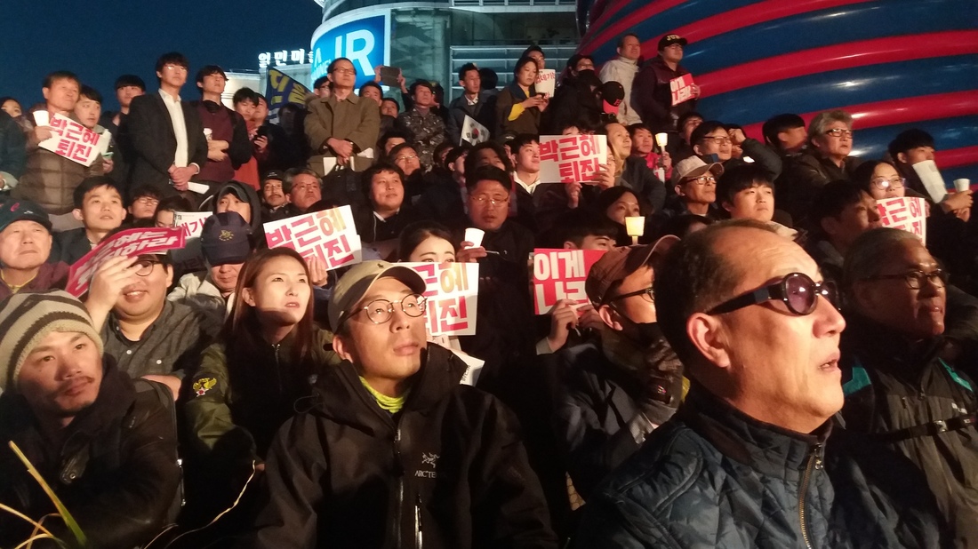 The public's beliefs about how much control the Choi family enjoyed over the president, and how much they privately benefited as a result, is putting the president's remaining year in office in serious jeopardy. On the streets of Seoul Saturday, at least 10,000 people showed up to protest, holding signs saying "Park Geun-hye, resign," "How is this a country?" and "We can't raise kids in this country!" (You can watch the protest live in the video below or click here if you can't see the player.)