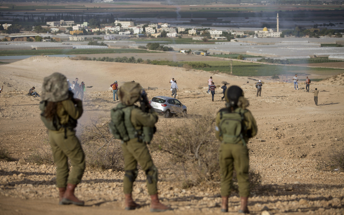 Palestinians and Israeli activists run away from tear gas fired by Israeli soldiers during a demonstration against the construction of Jewish settlements in the Jordan Valley, in the West Bank, on Nov. 17.