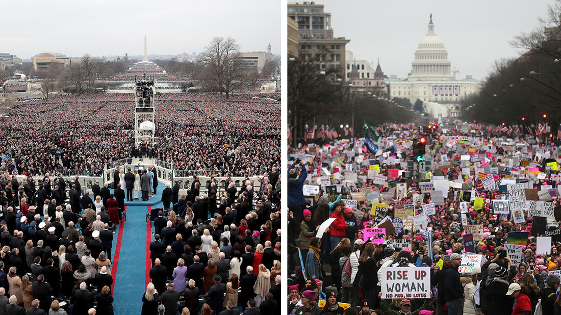 On the left, President Trump takes the oath of office at the U.S. Capitol on Jan. 20. On the right, protesters attend the Women's March on Washington the next day. Crowd estimates for both events were in the 100,000s but varied considerably.
